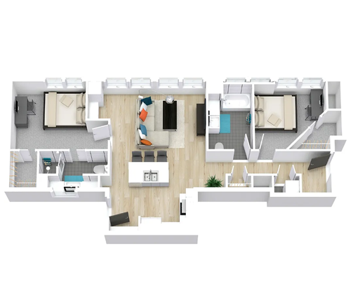 所有房间均配有独立卫浴和大号床(Queen Size),租金包含水费、网络及垃圾处理等费用。每个套间均配备冰箱、洗碗机、烤箱、灶台等全套厨房设备,并设有独立洗衣机和烘干机。