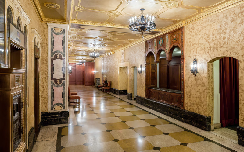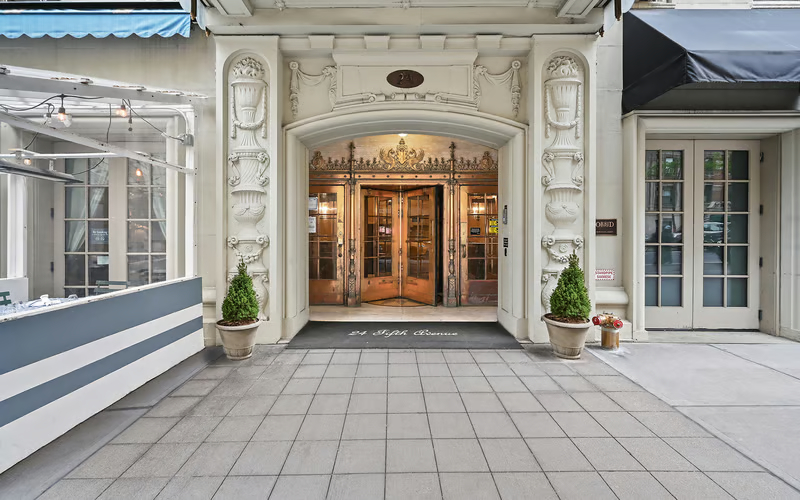 这栋位于格林尼治村核心地段的15层公寓由著名建筑师Emery Roth设计,1926年以Fifth Avenue Hotel的名义落成,最初面向永久住户。1987年的翻修保留了战前建筑的经典优雅。从宽敞大气的大堂进入,以雕刻灰泥天花板与大理石马赛克装饰的宽廊相连,而建筑最引人注目的特色是面向第五大道的青铜雨篷,被认为是这一著名街区上最令人印象深刻的住宅入口之一。沿街的玻璃封闭式咖啡区为社区增添活力。公寓对宠物友好,设有礼宾服务、健身中心、洗衣设施与自行车存放间,生活舒适无忧。