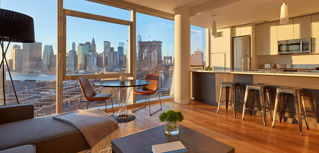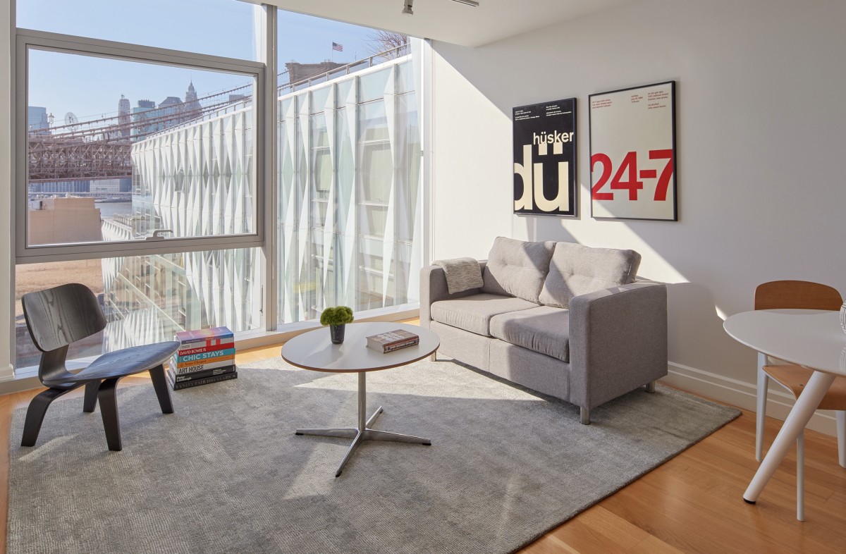 公寓提供采光极佳的 Studio、1B1B 与 2B2B 户型,部分户型设有私人露台或家庭办公区。室内采用橡木地板、落地窗、太阳能遮光帘及中央空调系统,厨房与浴室均配备 Caesarstone 台面与定制橱柜,家电选用 Leibherr 与 Bosch 品牌。住户可在由 High Line 景观团队 James Corner Field Operations 设计的屋顶花园中休憩,俯瞰东河与布鲁克林大桥全景,尽享布鲁克林最具代表性的滨水生活。