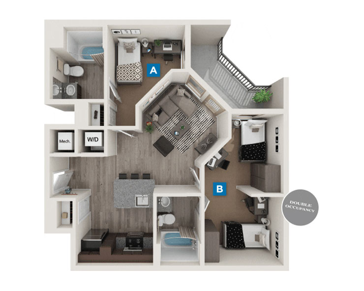 位于 UC Berkeley 附近的高端学生公寓社区,提供多种户型选择。公区设置学习室、会所、度假式露台和户外休闲区;室内为精装家具配置,设计舒适,细节温馨,适合独立或与朋友合租。
