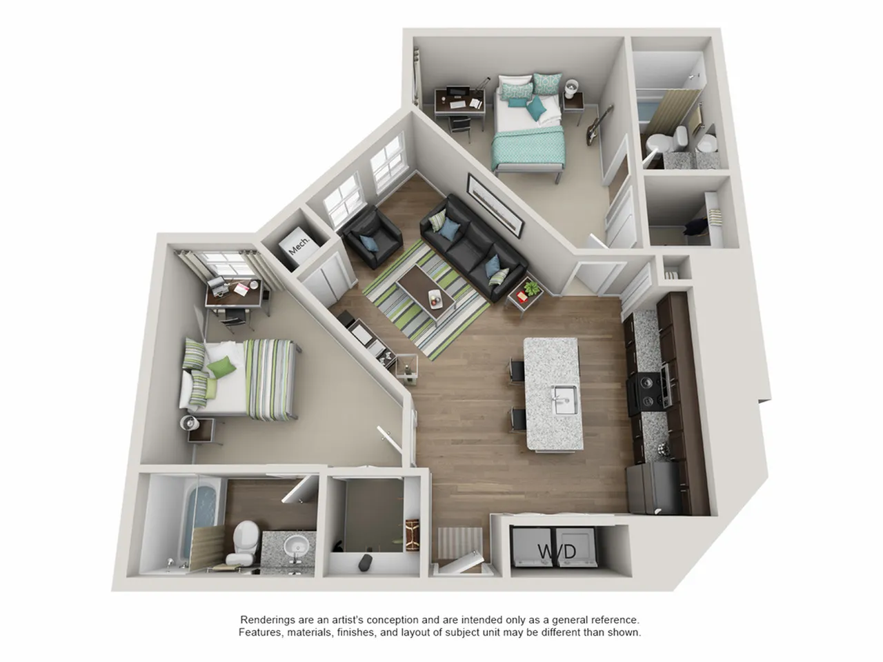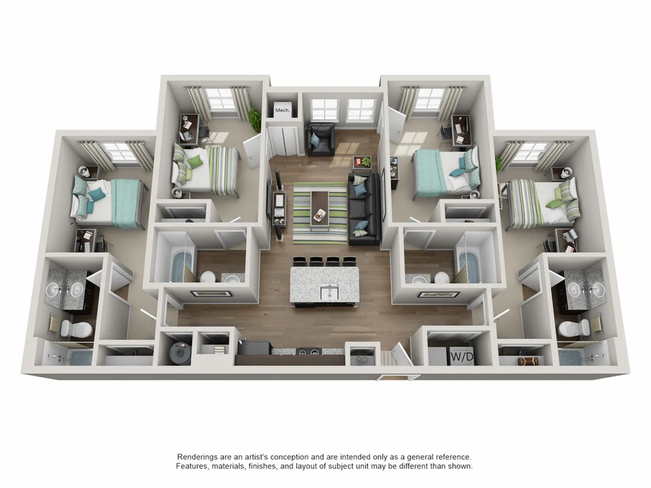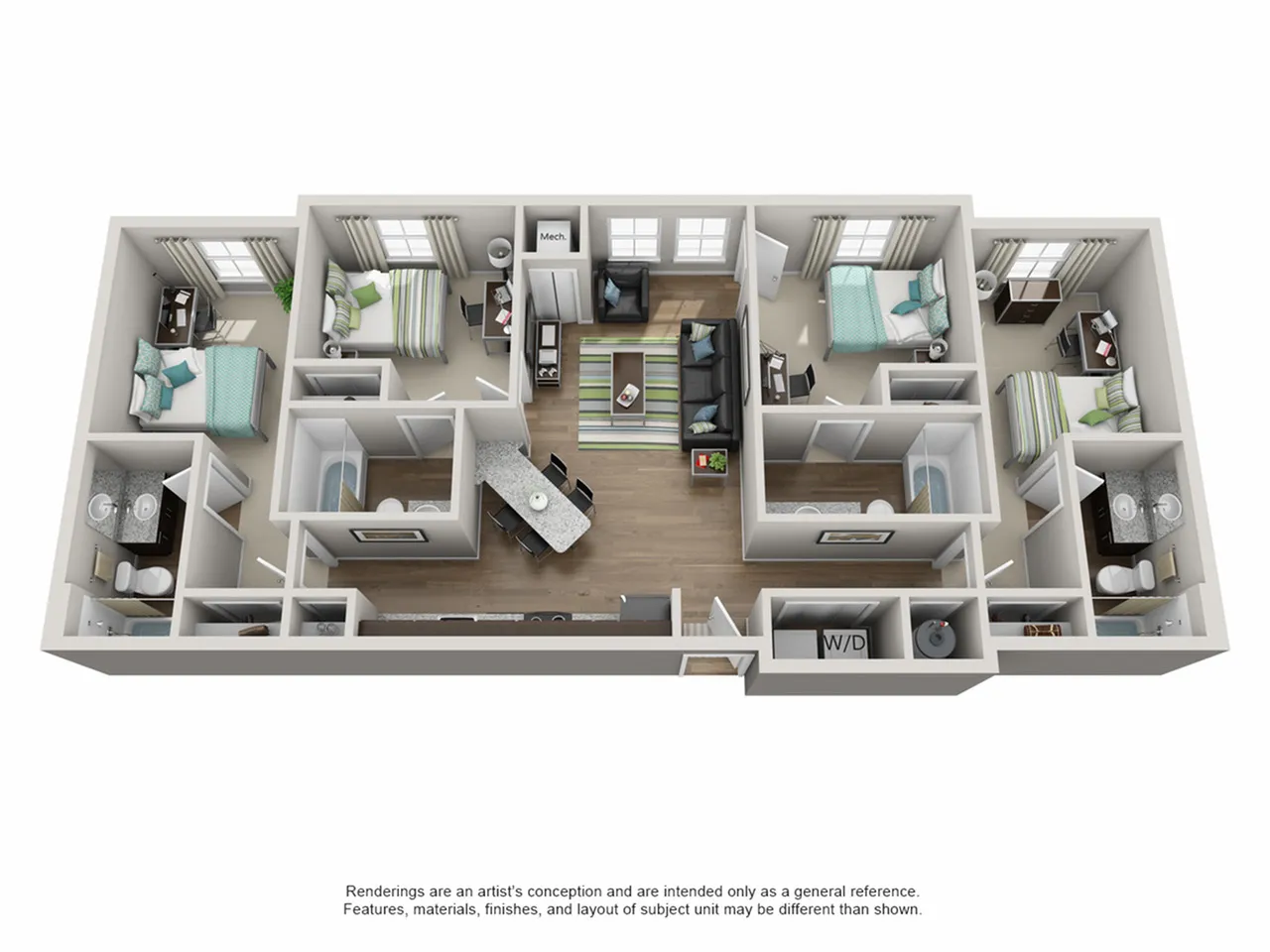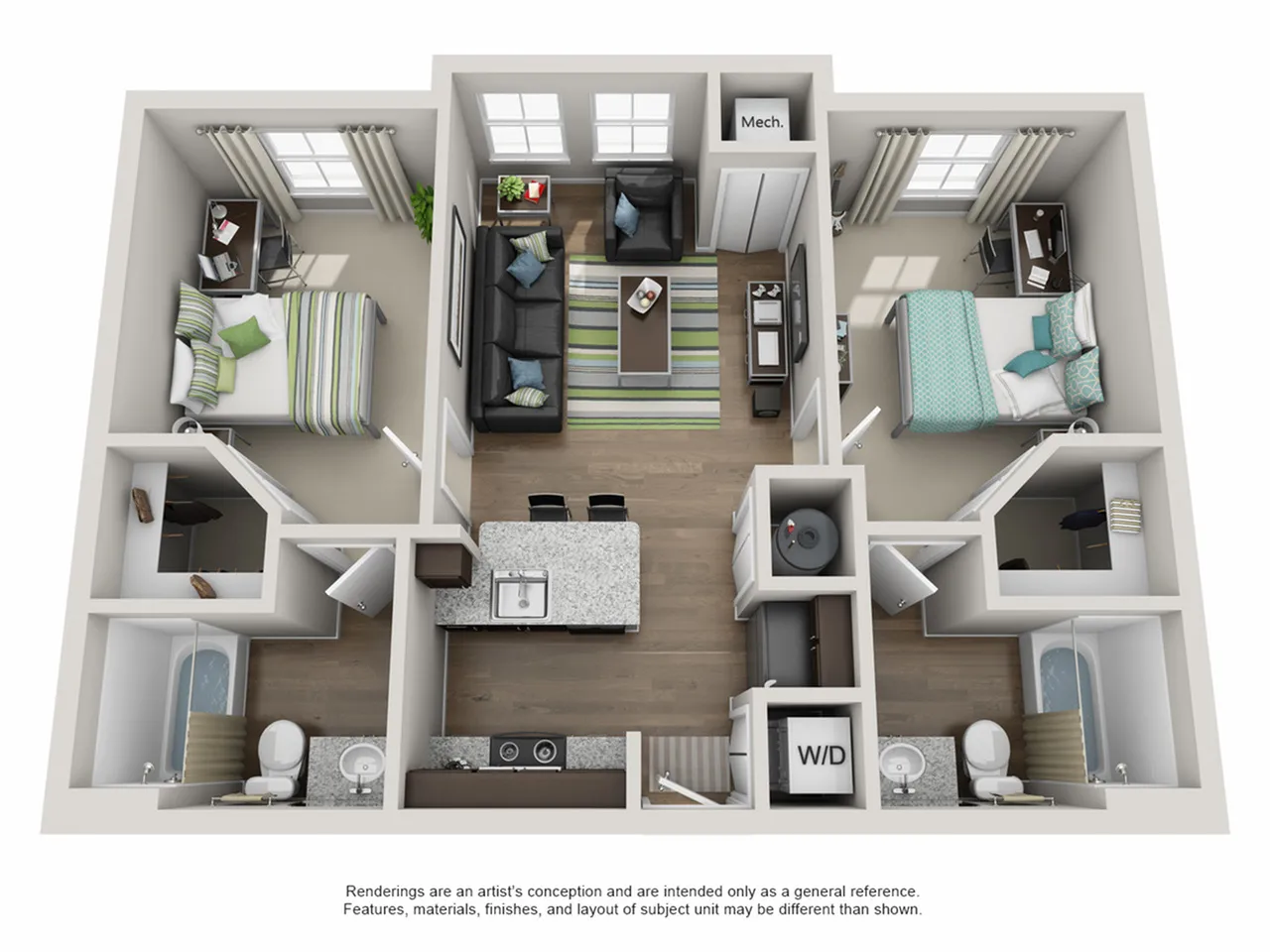 房间内配有书桌与学习椅、可堆叠的两个梳妆台、带记忆泡沫床垫的全尺寸床、咖啡桌和茶几、带配套扶手椅的沙发、吧凳,以及带制冰器的冰箱。每个套间均配备全尺寸洗衣机和烘干机。