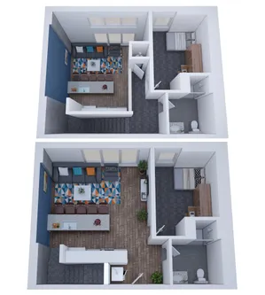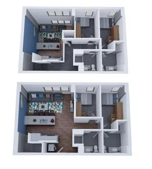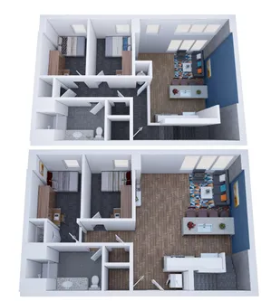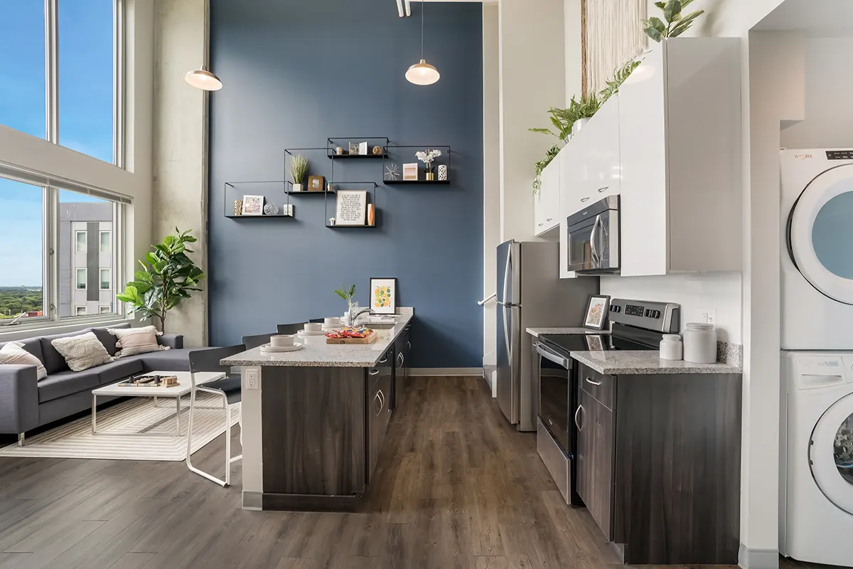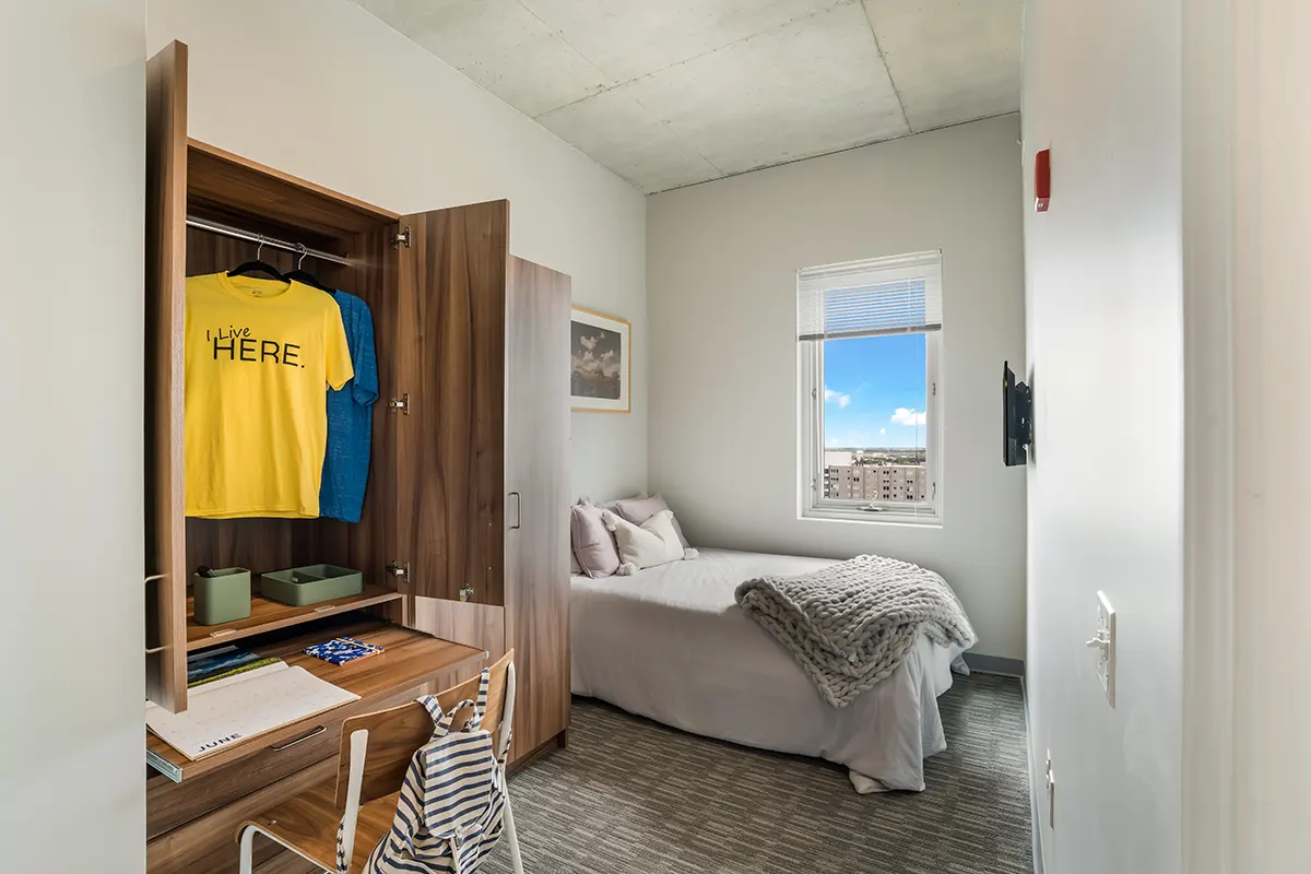 HERE Champaign每套公寓均为拎包入住配置,配有床、床垫、桌椅等全套家具。客厅设有安装式 50 英寸平板电视,彩绘重点墙搭配现代感十足的硬木地板。不锈钢厨具、石英厨房台面与欧式橱柜,营造出现代化烹饪空间。浴室为设计师风格,采用瓷砖淋浴与现代装置。每个套间内均配有洗衣机和烘干机。