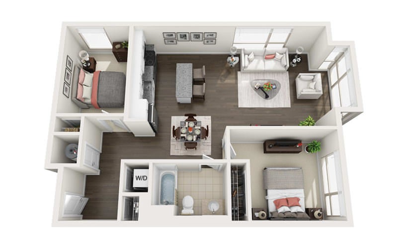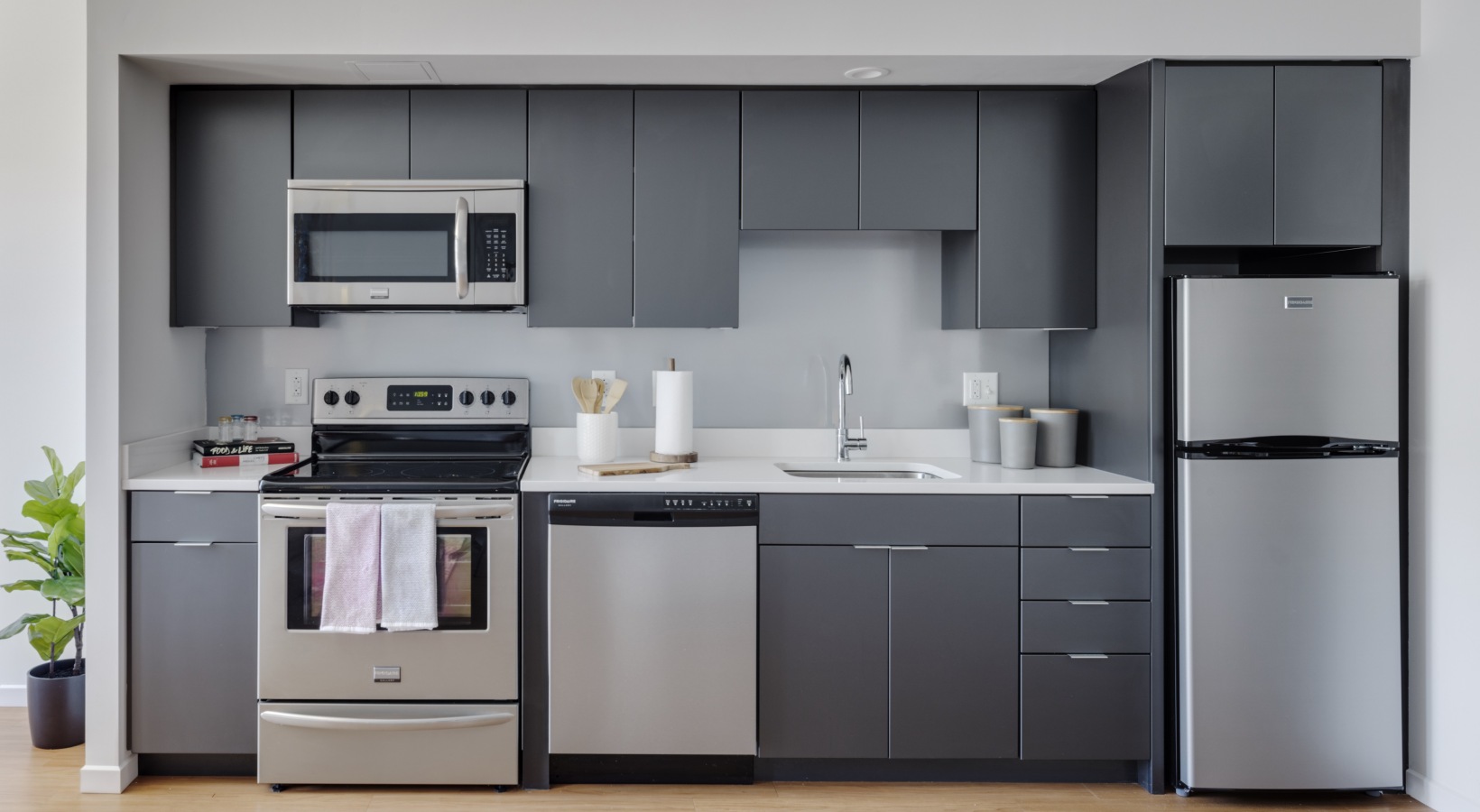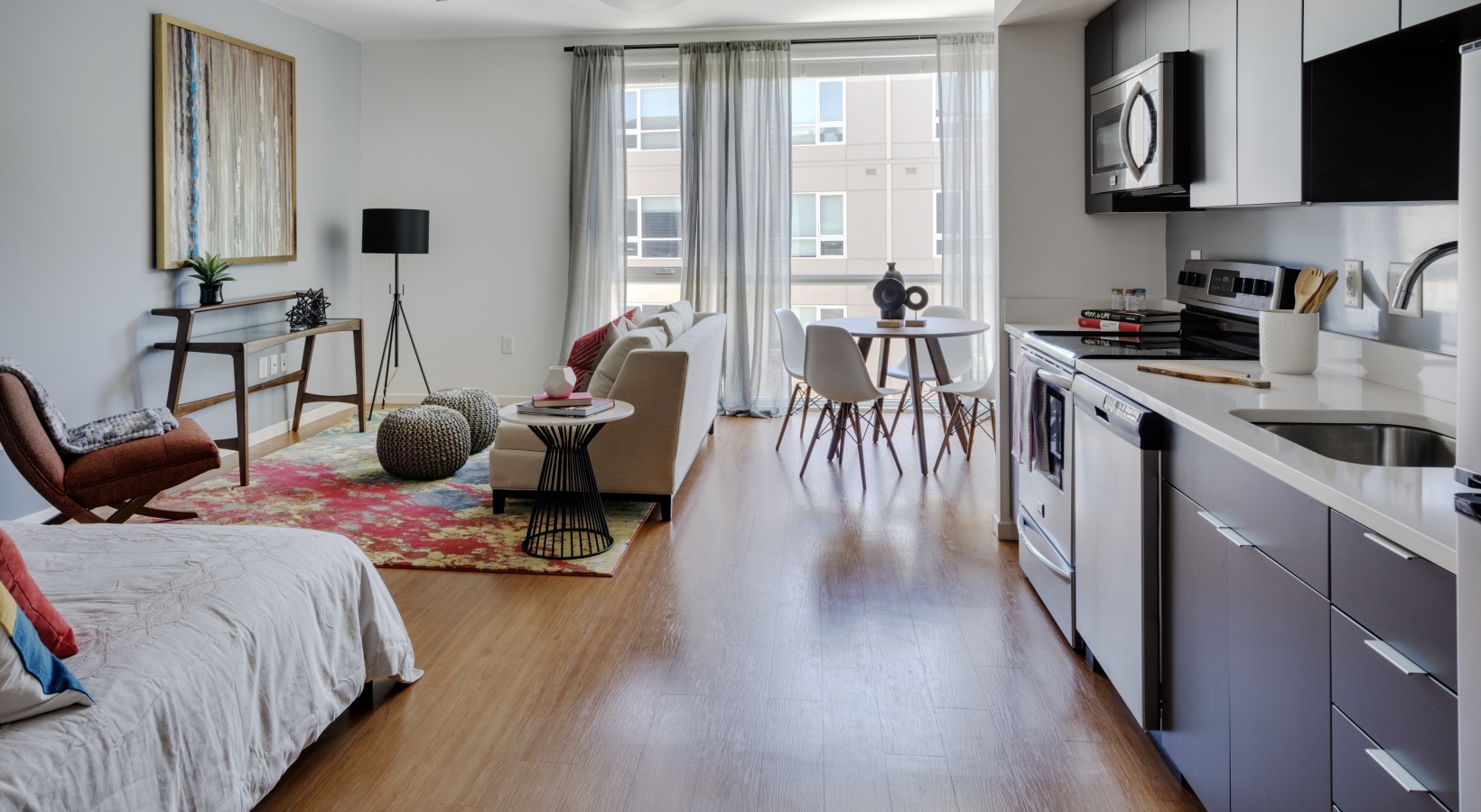 公寓内部设计现代,配备全套厨卫设施,包括灶台、冰箱、微波炉、烤箱和洗碗机,满足日常烹饪需求;房间公共区域铺设木地板,清洁方便,而卧室则采用舒适地毯,营造温馨居家氛围;每户配有独立洗衣机与烘干机,并设有步入式超大衣帽间及充足的储物空间。公共设施同样一应俱全:健身房、影音室、烧烤区、狗公园和休息室为居民的日常生活增添便利与乐趣,地下车库和快递代收服务则带来更多舒心体验。安全方面,公寓配备门禁系统、监控摄像头和专业管理人员,全天候为您的居住提供保障。