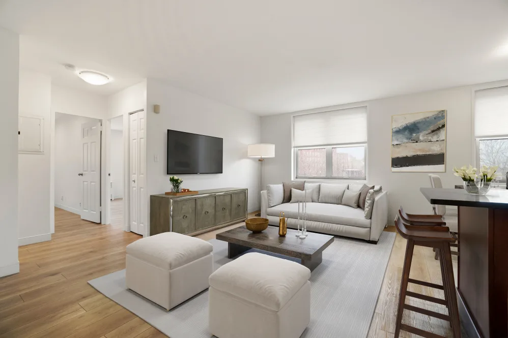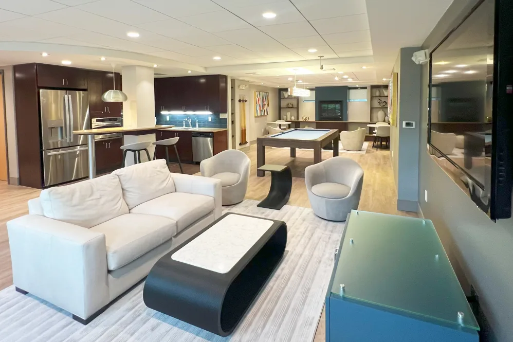 公寓翻新后,房间内部均配备现代化厨房,采用石英台面和不锈钢器具,拥有全套厨卫设施,包括洗碗机、灶台、冰箱、微波炉和烤箱,部分户型还配有中岛台。公共区域铺设木地板,方便清洁;部分卧室铺设地毯,舒适温馨。公寓配备暖气和窗式空调,四季居住无忧。房间内设有步入式衣橱和充足储物空间,部分户型更配有穿衣镜,实用又贴心。公共设施方面,公寓内配备健身房、休息室、娱乐区和公共洗衣房,并设有门禁系统和管理人员,安全有保障;同时提供地上停车场、电动汽车充电桩以及快递代收服务,让生活更加便利。