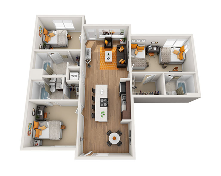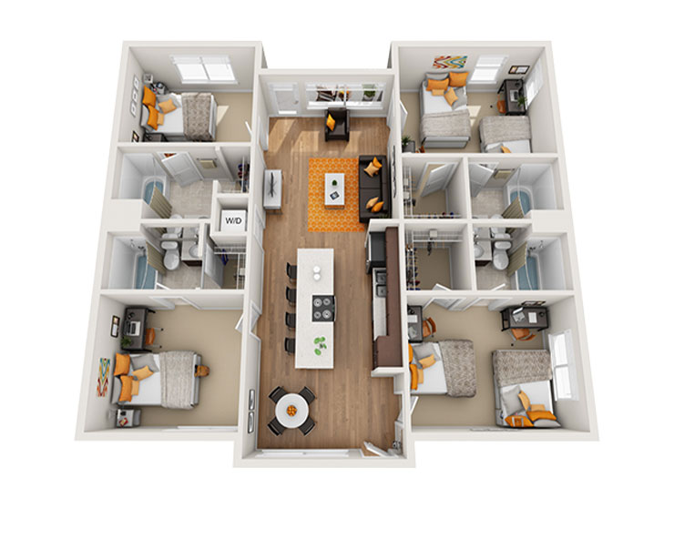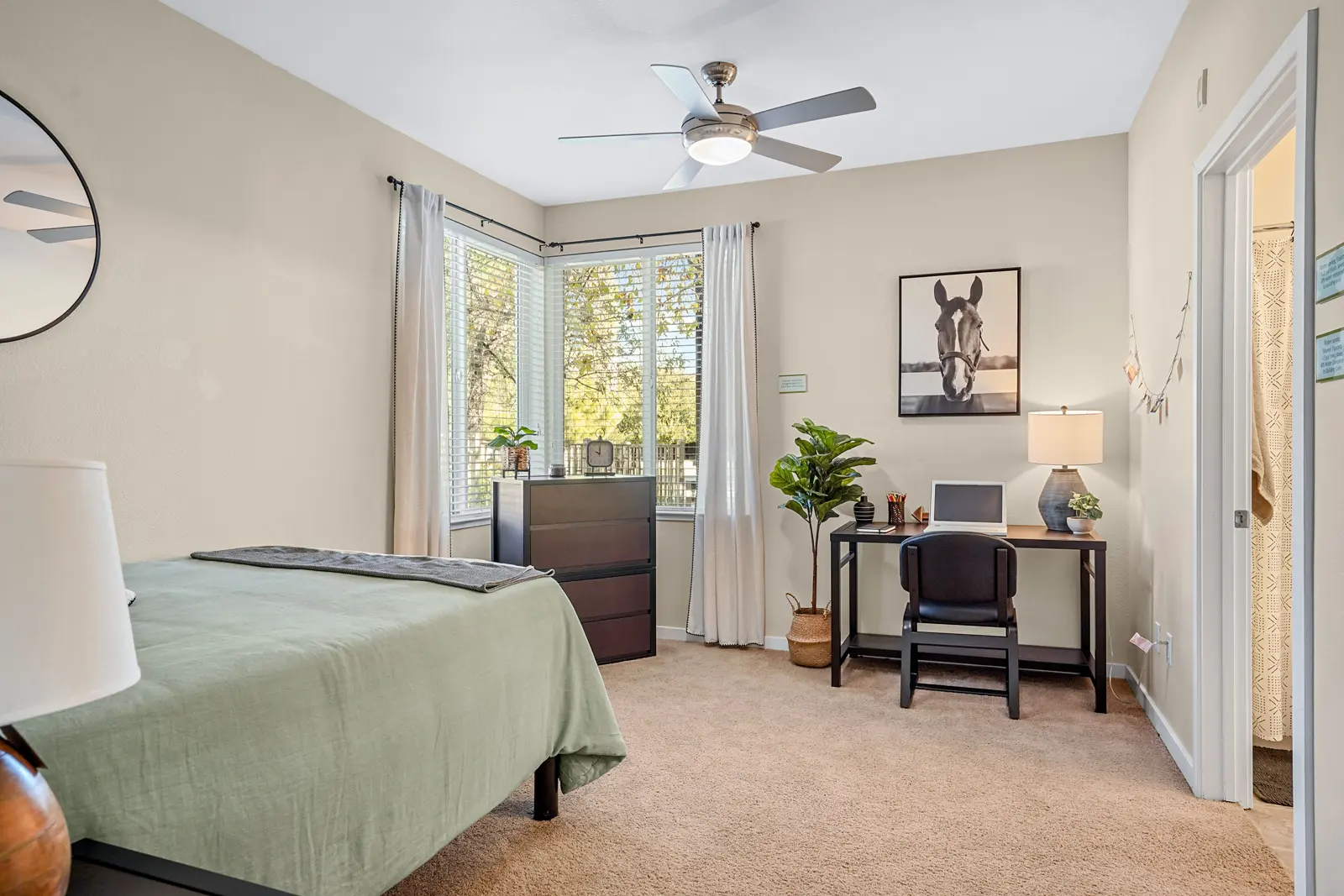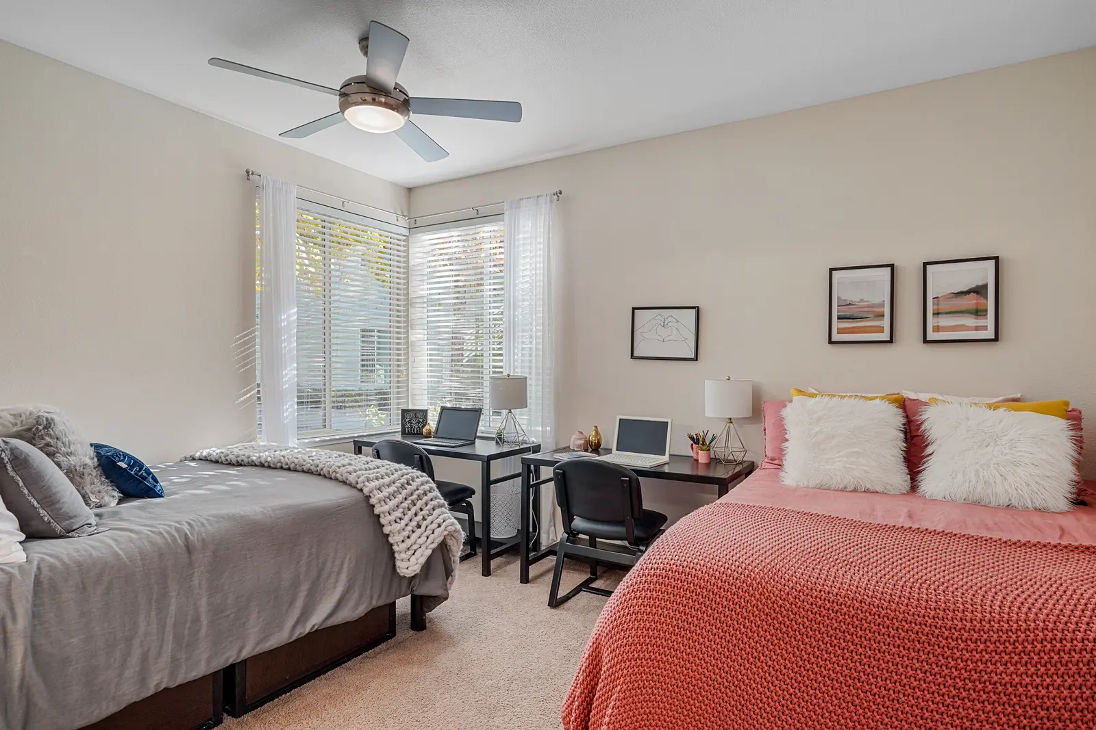 Sol at West Village 提供多种户型选择,包括 1B、2B、3B 和 4B 公寓,可选择带家具或不带家具的房型,按卧室或床位出租。公寓分为 Ramble、Solstice 和 Vardian 三个街区:其中 Vardian 社区为不带家具户型,住户可自行布置空间;Ramble 与 Solstice 社区则配备家具与床具,适合拎包入住的学生。每套公寓都设有宽敞的卧室、独立厨房(配备冰箱、炉灶、微波炉等)、客厅、洗衣机与烘干机,提供舒适便利的居住体验。公寓地理位置优越,骑行5分钟即可抵达UC Davis校园,步行即可到达健康体育场、餐厅、超市与农贸市场,生活与学习都极为便利。