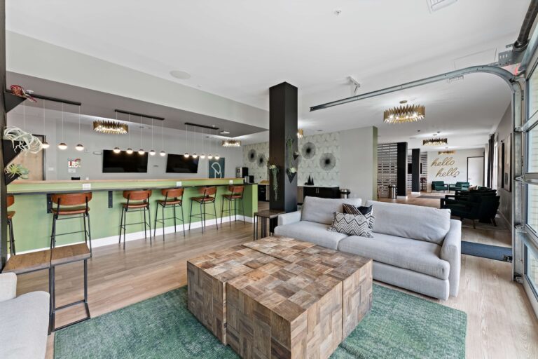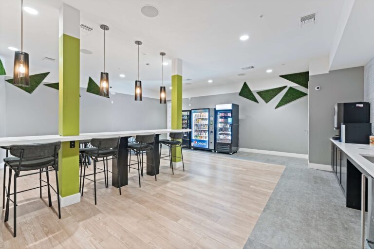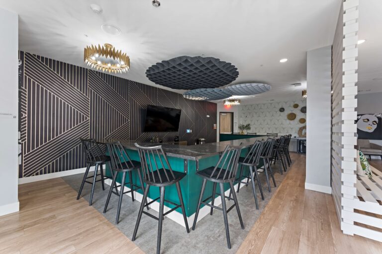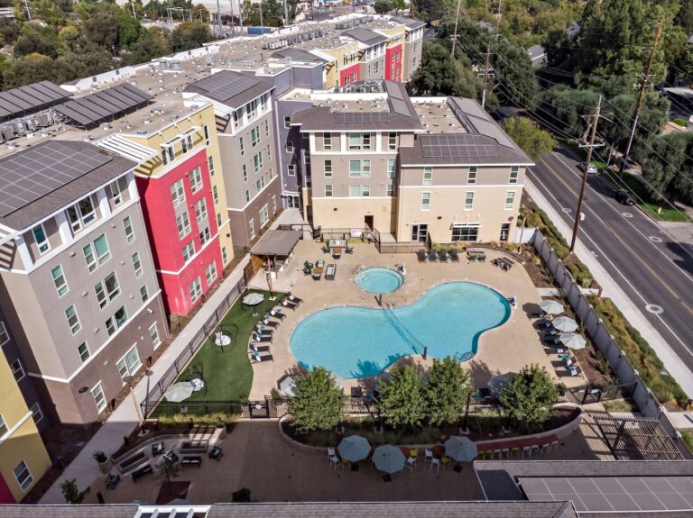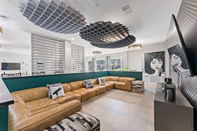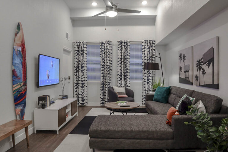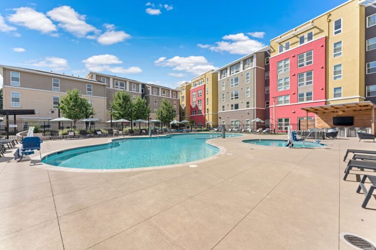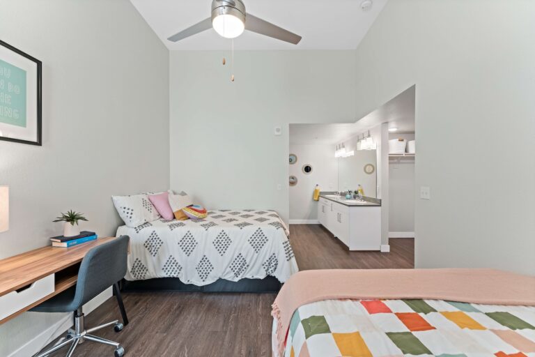 公寓提供全套家具配置,卧室配有带储物空间的 full-size 床、书桌与椅子;客厅配备 55 英寸平板电视、沙发与茶几;厨房区域配有冰箱、洗碗机、烤箱、微波炉与灶台等全套厨房设备。每个单元都设有独立洗衣机与烘干机,生活便利度极高。公共区域设施丰富,包括恒温游泳池、24 小时健身房、卡拉 OK 室、邮件及包裹收发室,以及 24 小时紧急服务,为学生提供舒适、安全且充满活力的居住体验。