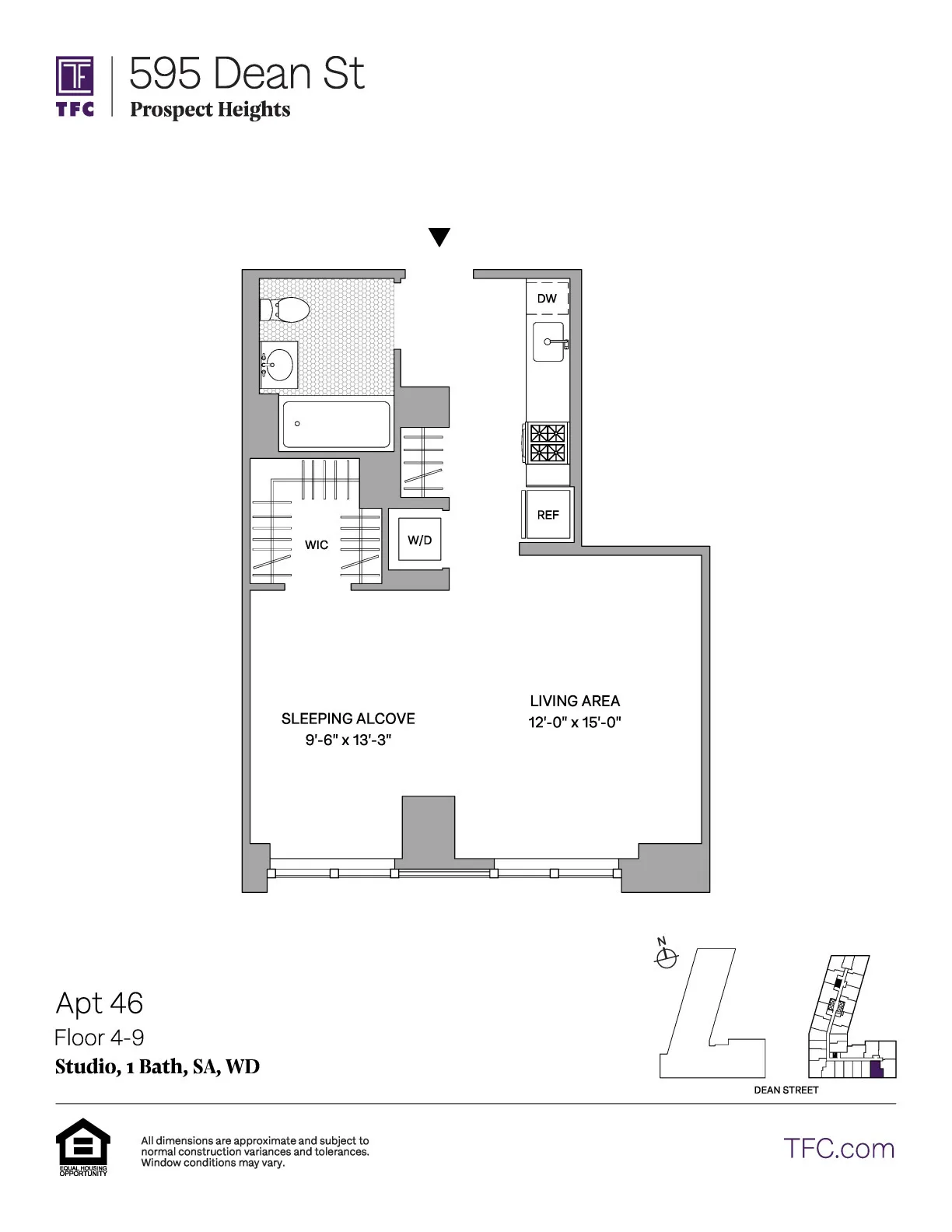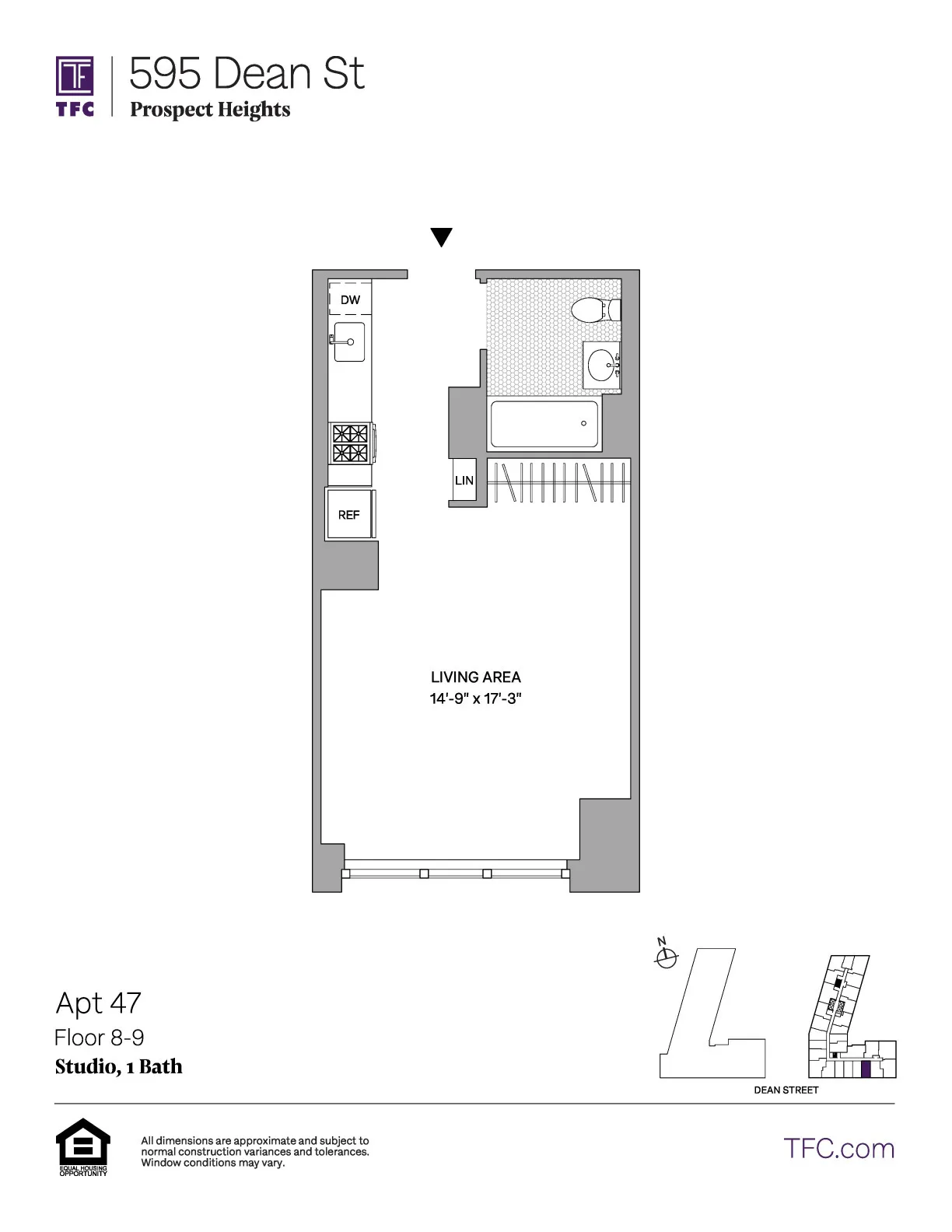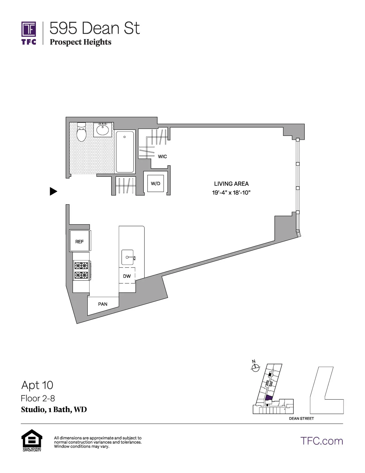 595 Dean St 公寓距离 Prospect Park 仅数步之遥,周边环绕着布鲁克林褐石街区的独特魅力。公寓提供 Studio、1B1B 和 2B2B 户型,均配备 Caesarstone 石英台面、燃气灶具及现代化装修。部分户型拥有私人露台、超高层高以及室内洗衣机和烘干机,让生活更加便捷舒适。房间类型