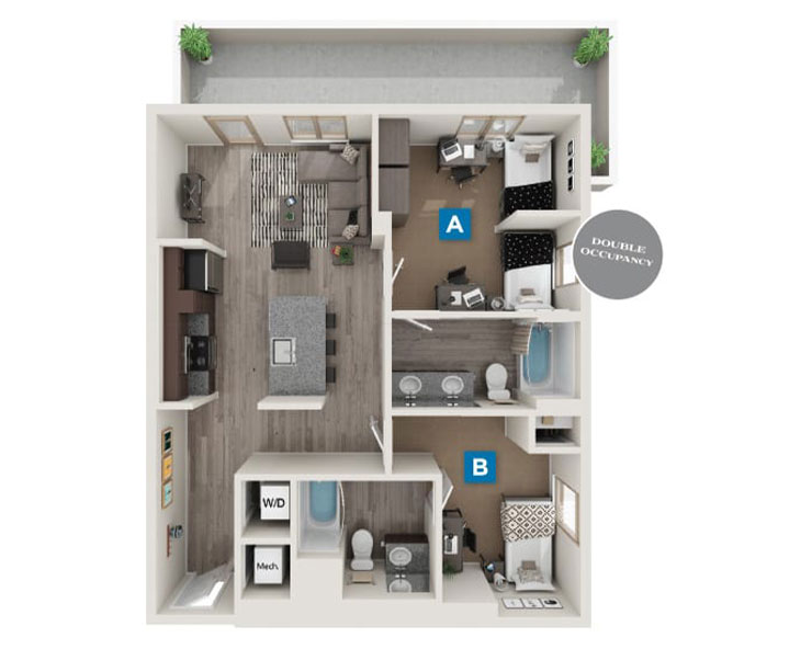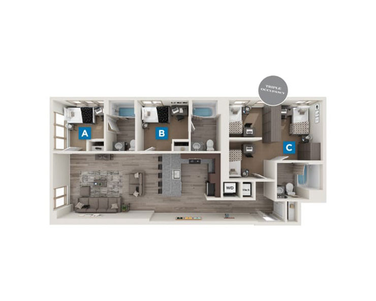 位于 UC Berkeley 附近的高端学生公寓社区,提供多种户型选择。公区设置学习室、会所、度假式露台和户外休闲区;室内为精装家具配置,设计舒适,细节温馨,适合独立或与朋友合租。