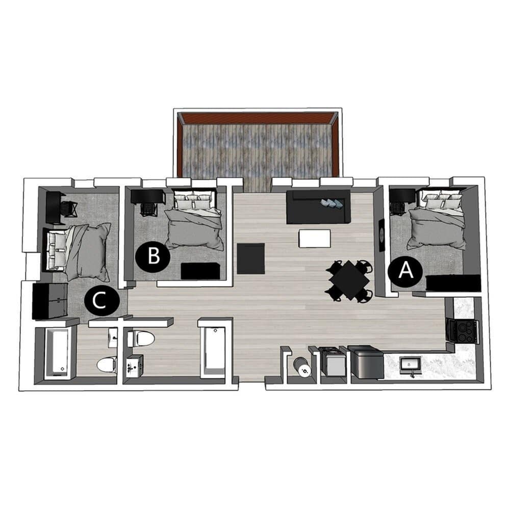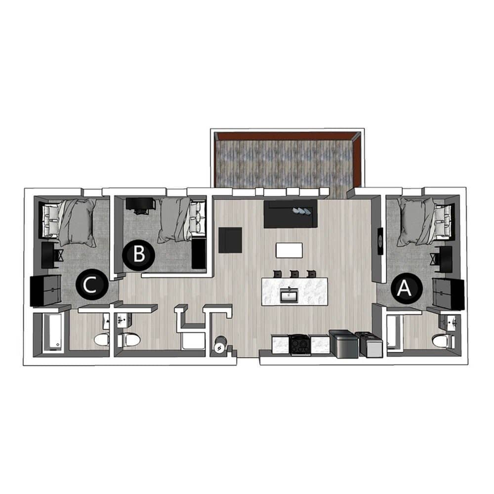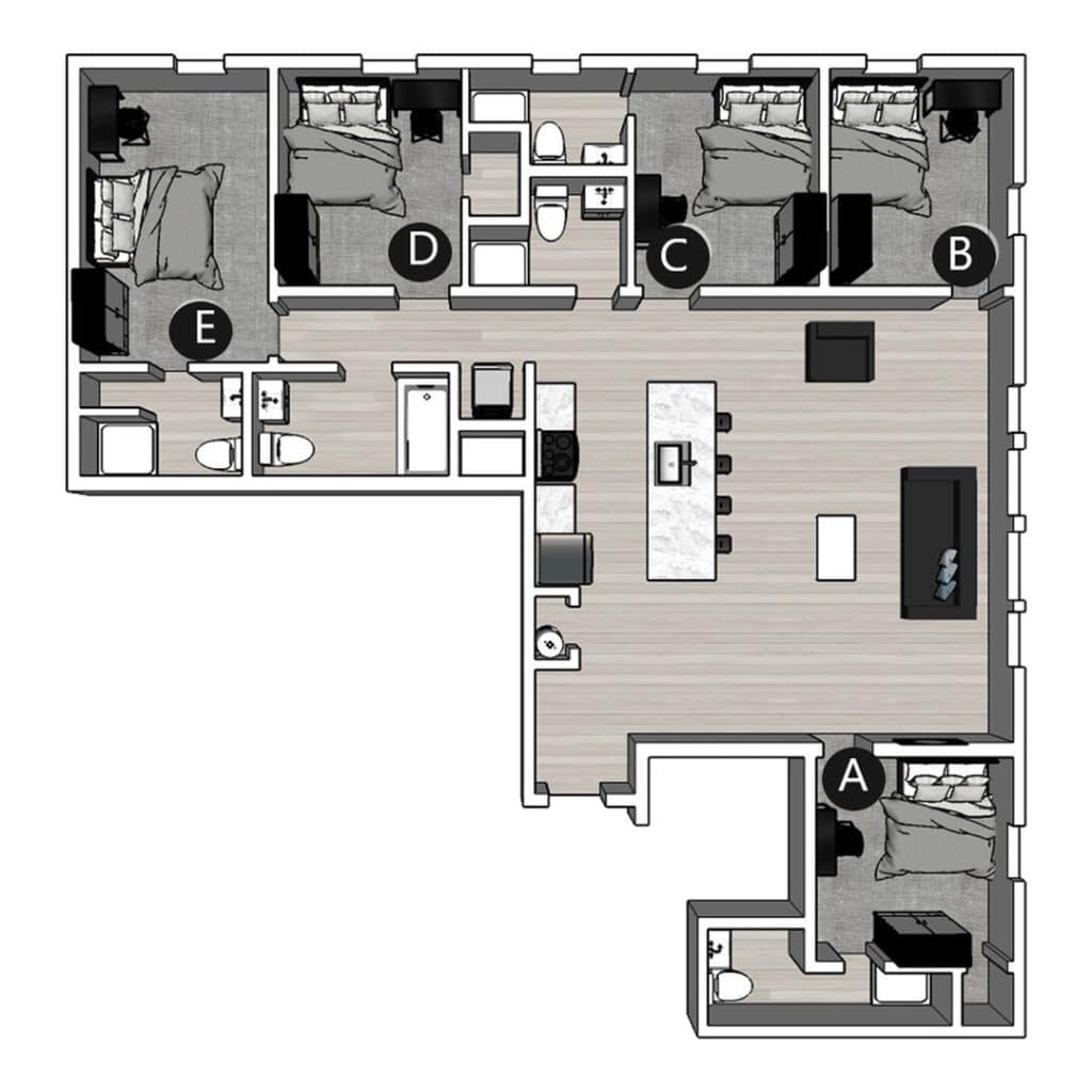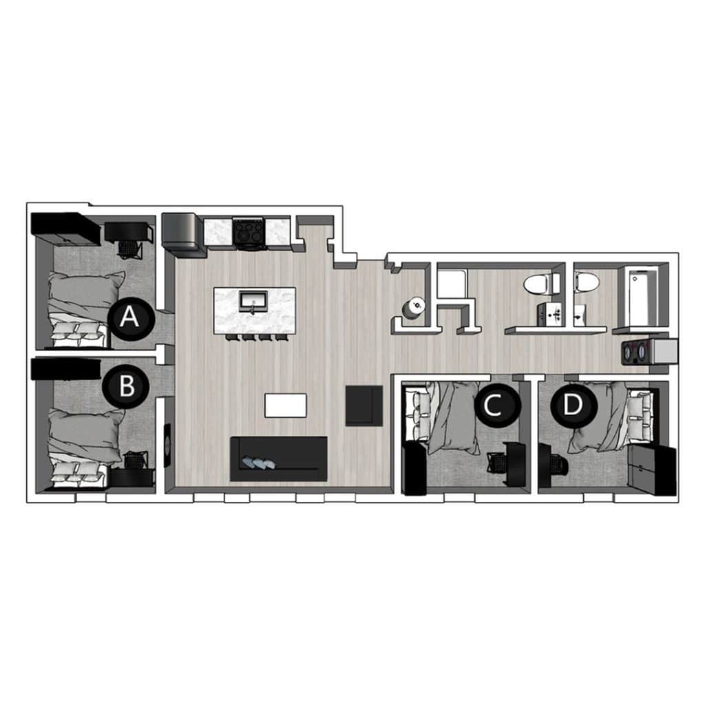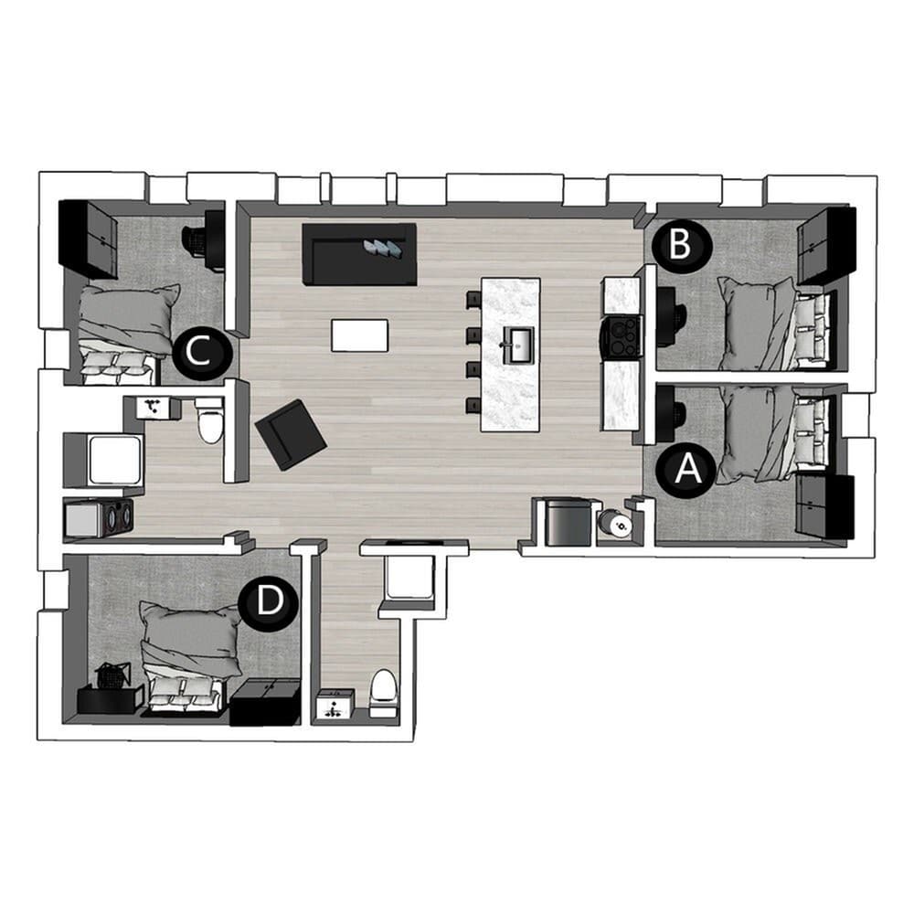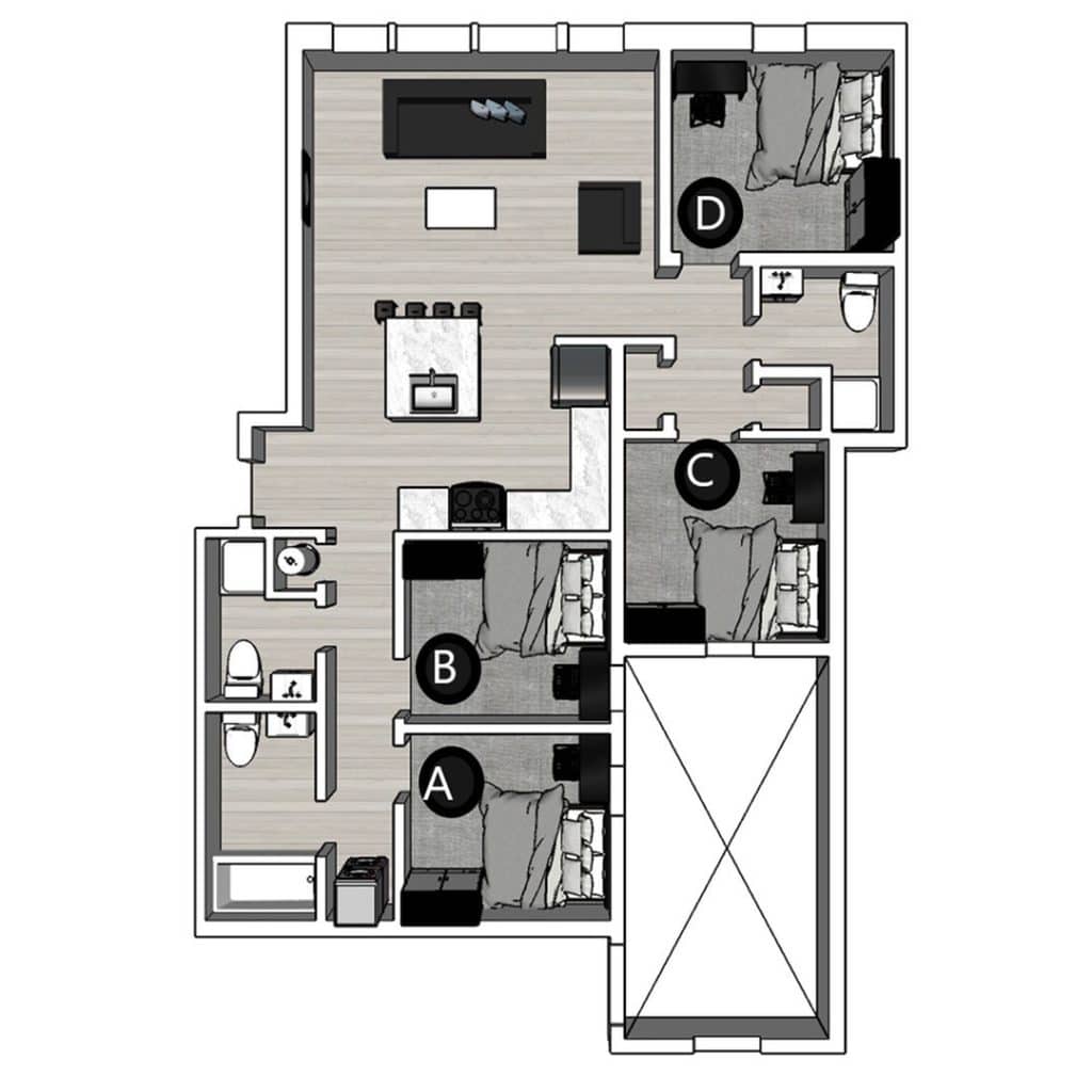 位于 Collegetown 核心位置的 The Lux 与 The Lofts 两大社区,为康奈尔大学学生提供安全舒适的理想居住环境。The Lux 坐落在 Summit St.,拥有一房到五房多种户型,步行即可到达康奈尔校园,并配备屋顶露台、健身中心与学习室等完善设施,完美平衡学习与生活。The Lofts 位于 College Ave.,提供一房到四房的时尚阁楼式全配家具公寓,住户可在健身区开启活力一天,或在媒体影音室与好友放松聚会,是追求空间感与设计感的学生首选。房间类型