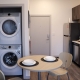 家具齐全,配备 full size 床、书桌、椅子、智能锁、平板电视及高速 wifi。厨房设备完善,包含冰箱、洗碗机、烤箱与灶台等全套配置。每个 unit 均配有独立洗衣机和烘干机。